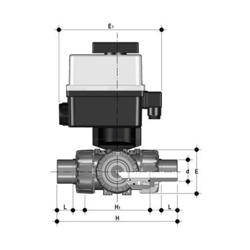 | 3-Wege-Kugelhahn aus PVC-U mit elektrischem Stellantrieb mit Endlagenrückmeldern, Handnotbetätigung und optischer Stellungsanzeige Kugel mit T-Bohrung Standardkugelstellung: 1 Stellantriebsdaten: Standard 90-240V / 50-60Hz (AC) ohne Aufpreis 24V AC/DC Andere Spannungen auf Anfrage ***DN50 = PN16 auf Anfrage Anschluss: PE-LS-Stutzen zum Heizelementstumpf- und Heizwendelschweißen (PN16 bei Wasser 20°C) Dichtung: PTFE/EPDM |