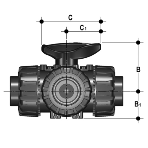 | -Bohrung: T-Bohrung -Anschluss: Klebestutzen -radial ein- und ausbaubar -mit gesicherter Überwurfmutter -Dichtung: PTFE/FPM -mit allseitigen Festflanschen aus PVC-U auf Anfrage |