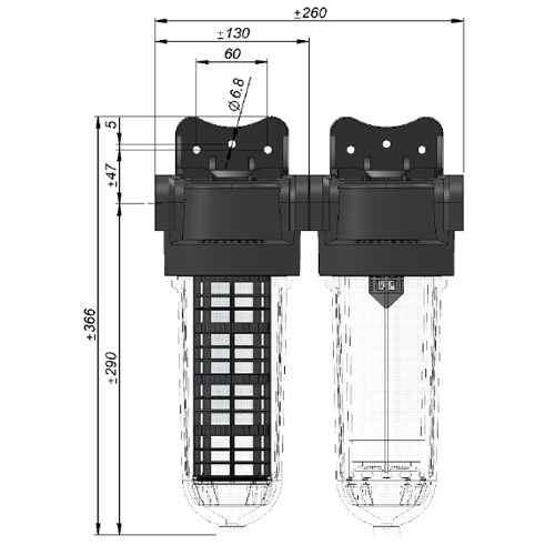 - Serienmäßige Ausstattung: Filterfliese 25 Mikron, mit Aktivkohle befüllte CTN-Kartusche, Schlüssel, 2 Wandbefestigungen aus PP + 30% GF