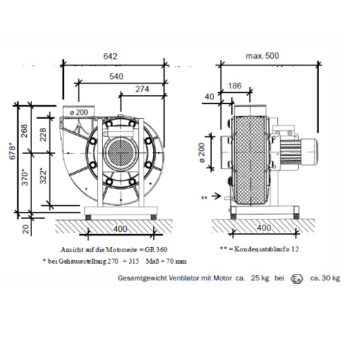 Direktgetriebener Radialventilator zur Förderung aggressiver und explosionsfähiger Gase, Temperatur max 40°C Ventilator II 3G c IIB T3 X 05 ATEX D085 Gehäuse aus PPs, in gespritzter Ausführung mit integrierten Dichtungssystem, bestehend aus Kondensatwehr als umlaufende Tropfkante und einer Labyrinthdichtung, mit zusätzlicher Fettsperre, von aussen nachfüllbar, und Lippendichtung, Kondensatablaufstutzen an der tiefsten Gehäusestellung Laufrad mit rückwärtsgekrümmten Schaufeln aus PPs, in gespritzter Ausführung mit Rückenbeschaufelung für garantierten Unterdruck an der Wellendurchführung im Betrieb, Gehäusestellung GR, Ausblasrichtung 45° / 90° / 135° / 180° / 270° / 315° /360° Grundrahmen: Stahl-verzinkt Antrieb : Normmotor ATEX- konform EEx e II 2G T3 3 x 230/400V, 50 Hz, IP55, Wärmeklasse F, Zubehör : Gummi -Schwingungsdämpfer saug- und druckseitige Schutzgitter sind bauseitige Leistung durch Kunden Volumenstrom m3/h 160 - 1300 Druckdifferenz PA 310 - 90 EEx e II T3 Polzahl 4 Sync. Drehzahl bei 50 Hz 1500 1/min Motorleistung kW 0,25 Nennstrom bei 400 V 0,79 A Baugröße 71 Bauart B5 / IP55 |